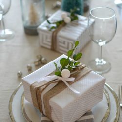 I used our grey and teal napkins to carry the existing colour palette throughout the room. To add a natural feel I tied twine around the napkins instead of using traditional napkins rings and added a few cedar branches to each place setting.