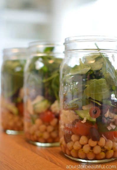 - Layer chickpeas, tomatoes, cucumber, red onion, black olives and feta in a mason jar.