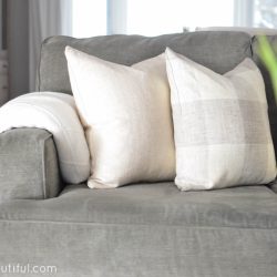 We have grey couches in our living room, which I love because they hold up so well with pets and children, but I would love crisp white couches some day. In the meantime, I like to lighten up our couches up by adding light colored pillows.