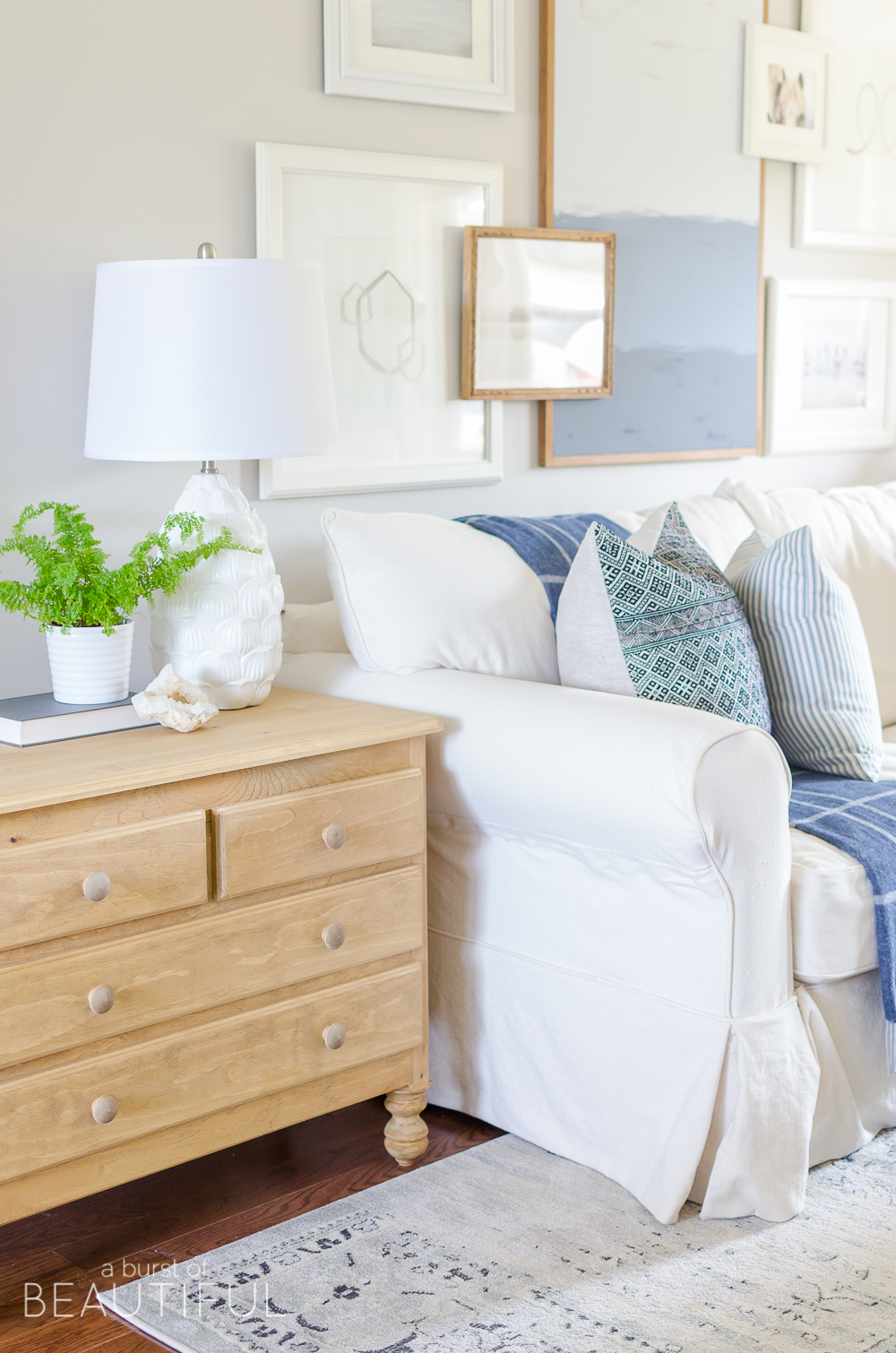 Nick built this beautiful piece for our living room after I spotted a few similar dressers in magazines and home decor books. I was looking for a small side table to replace the industrial pipe table he built a few years ago. Aside from simply wanting to make a few changes to freshen up our living room, we wanted to add another piece that doubled as functional storage space.
