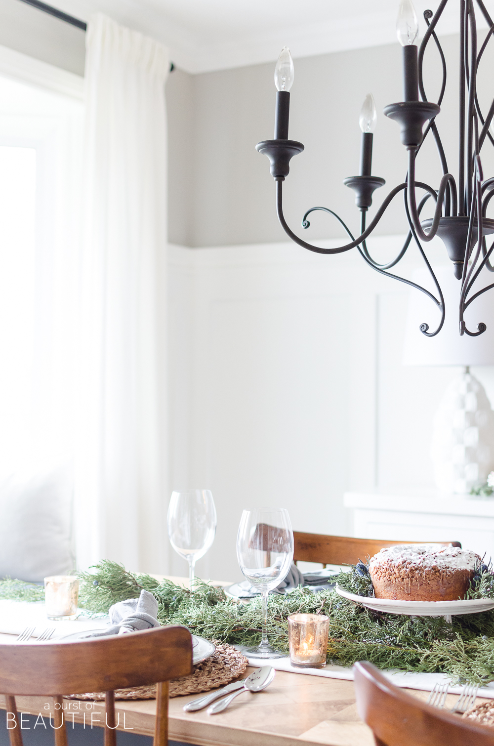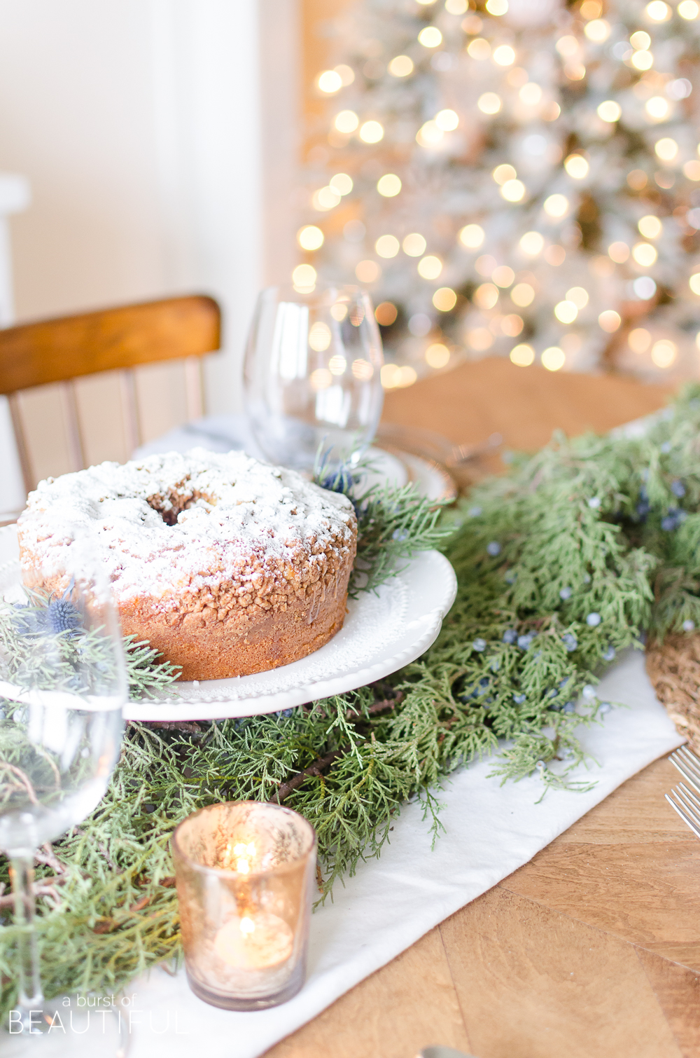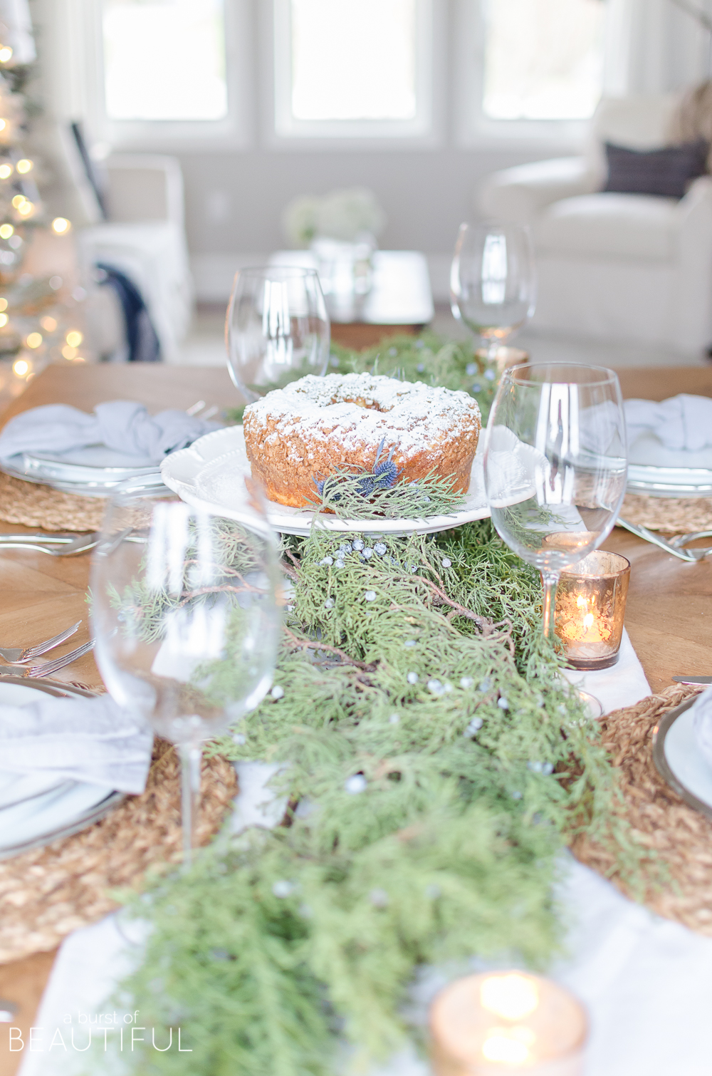 And for an inexpensive and easy centerpiece, I placed a store-bought bundt cake, sprinkled with icing sugar and adorned with juniper and blue thistle. It doesn’t get much easier than that, does it?