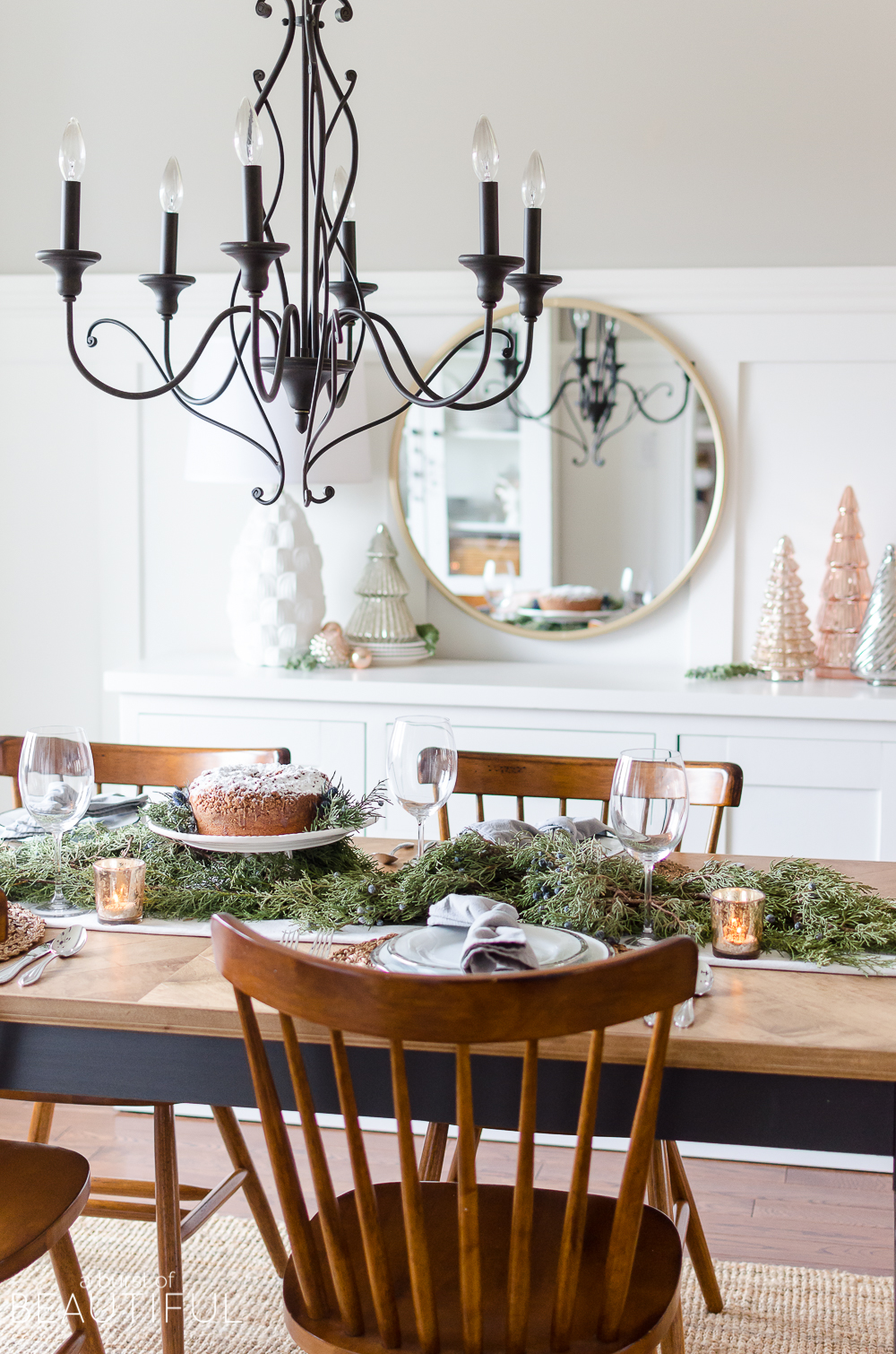 For a little hint of holiday sparkle and shine, I place a few rose gold votives throughout the greenery. I tried adding a few pillar candles mixed in as well, but I felt like it took away from the simplicity I loved so much.