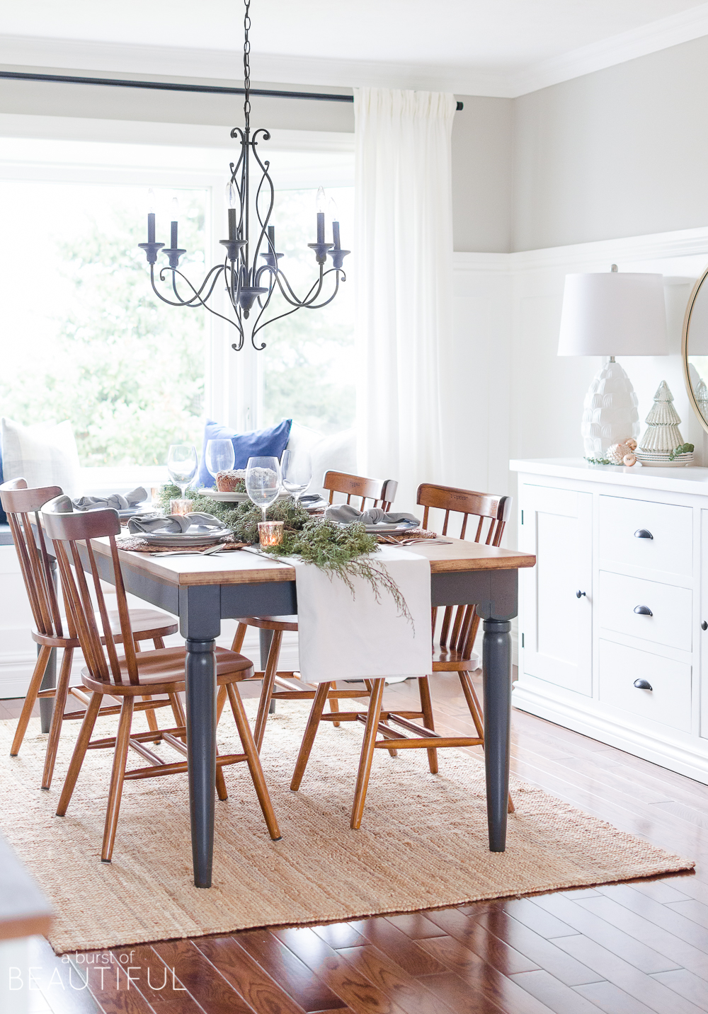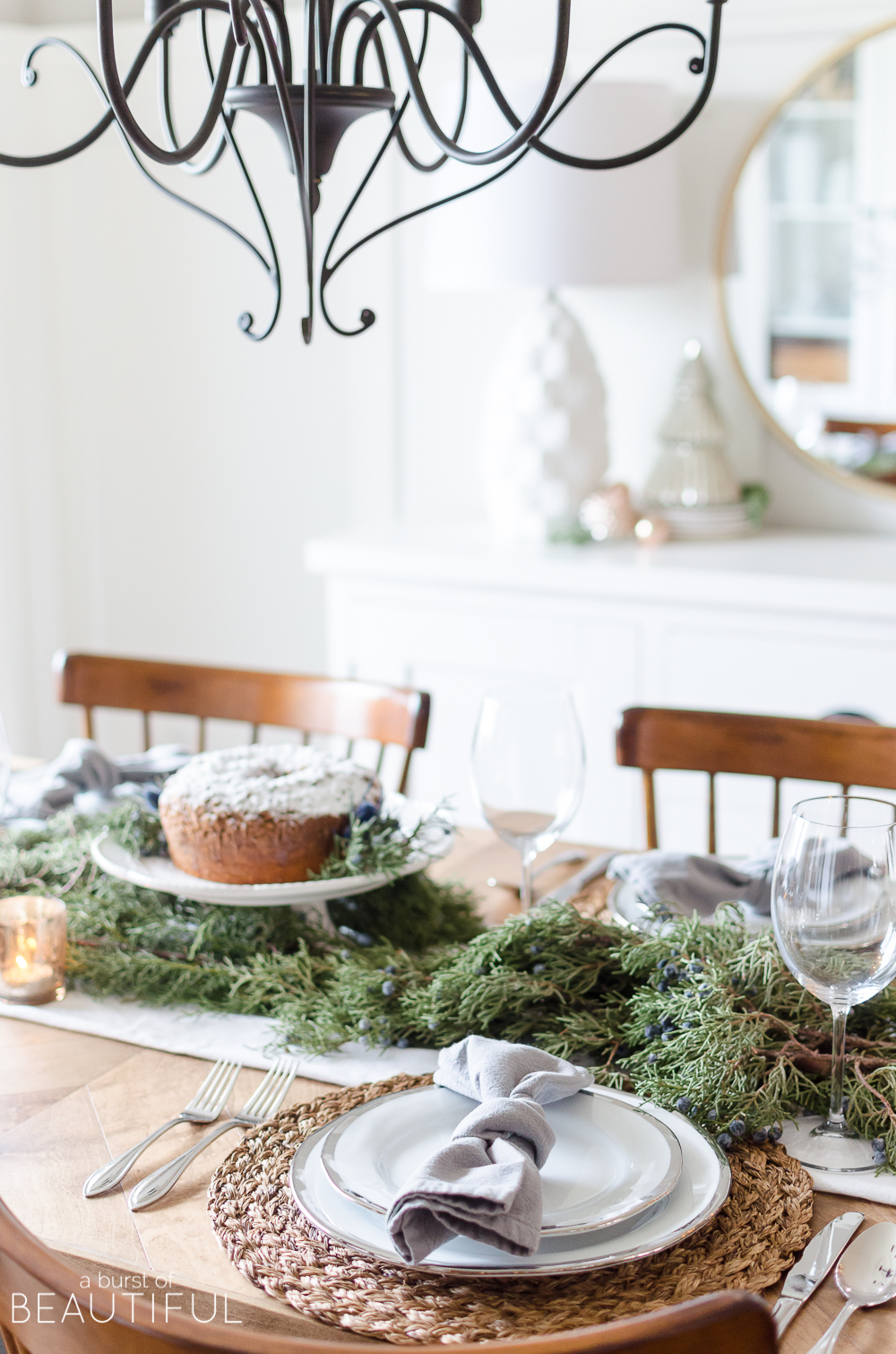 I chose this beautiful juniper simply for the little pops of blue berries throughout…because you know how much I love the color blue. 😉 I also added a few branches of this Carolina Saphire, I love the way it arcs and drapes at each end of our table.