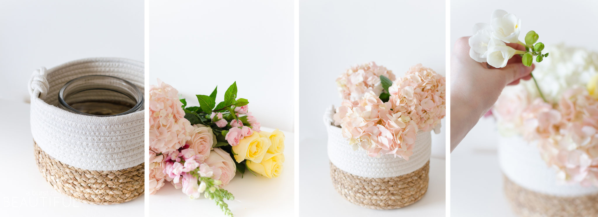 Every time I create a flower centerpiece, I try to think outside of the box and arrange it in something other than a basic vase. There is absolutely nothing wrong with using a vase, I just feel like I share so many tablescapes on our blog that I want to give you new and fresh ideas. I’ve used everything from a utensil holder to a large bowl, and this time I used this cute two-toned woven basket.