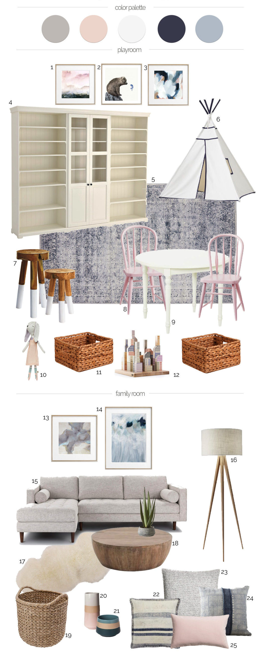 We’ve divided the main living space into two distinct sections, one for a playroom and one for a family room. And even though we’ve made this distinction the spaces are still open to one another so our design plan definitely had to take that into consideration. I wanted the two areas to feel cohesive and flow well together, I also wanted these two areas to be able to grow with our family. So with that in mind, I designed a playroom that feels sweet and playful, while still having many grown-up aspects to it.