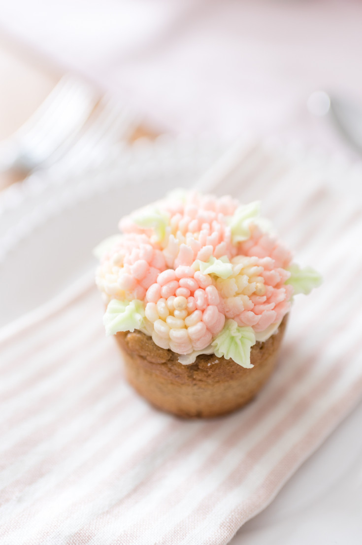 When we were dreaming up this recipe, I was envisioning each cupcake with a gorgeous floral design made from piped icing. But we also wanted it to be easy, not many people have time to spend hours and hours decorating cupcakes. So we picked up a few tools from our local craft store which made decorating them so easy. Honestly, we weren’t sure how they were going to turn out, but the end result is even prettier then we imagined. It only took a little bit of practice before jumping in and we had the technique down in no time.