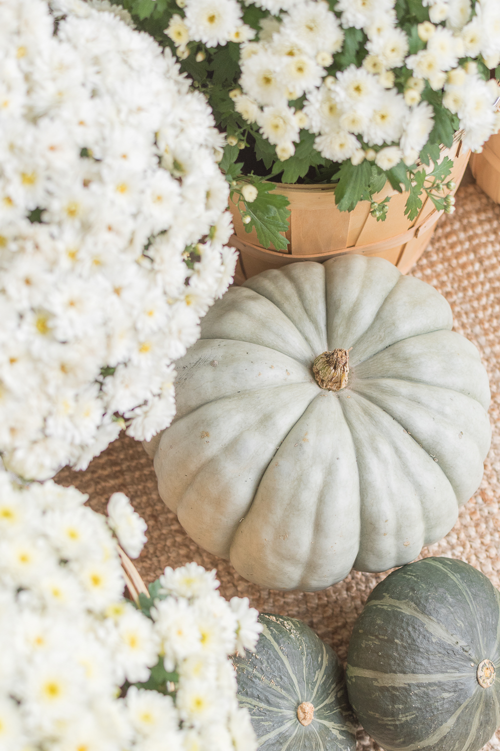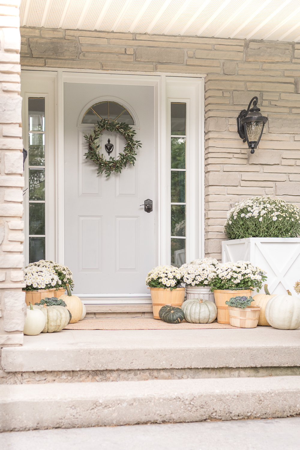 I love neutrals and soft muted colours, so our front porch reflects that. This year I bought white mums and a variety of pumpkins and squash in shades of white, yellow and green. There are no surprises when you walk through our front door, you’re greeted by a very similar style and colour palette in our home.