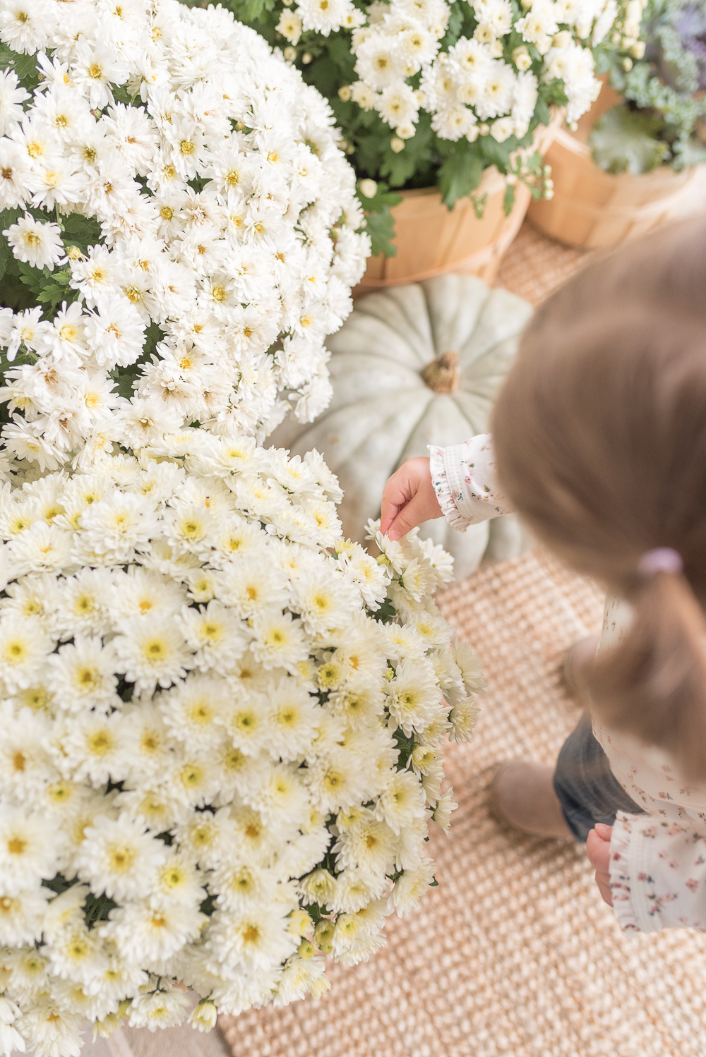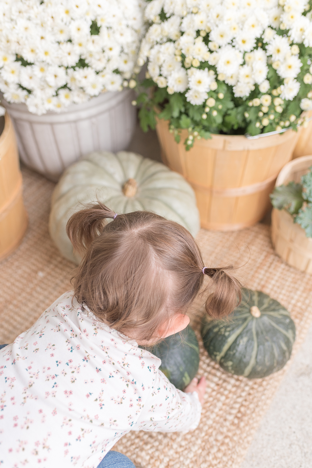 Decorating our front porch only took a few hours between heading to the store to buy mums and pumpkins and bringing them home to set up. Remember to be creative and think outside of the box, decorating your home should be fun! Speaking of fun, Ella loves our fall porch. Every time we are outside she just has to visit our front porch and loves piling the squash right in front of the door. And I have fun seeing everyone in our family enjoy the little touches I add for the season.