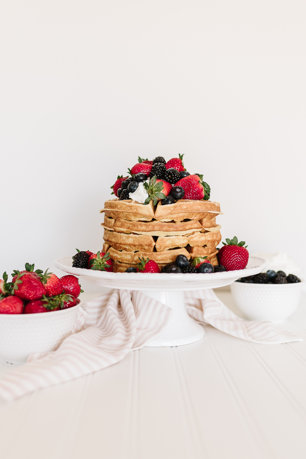 While Nick was perfecting this recipe, I was thinking how perfect these waffles would be topped in whipped cream, a generous helping of fresh berries and a sprinkle of powdered sugar. They are the perfect way to dress up any table for a spring celebration, like Easter or Mother’s Day.