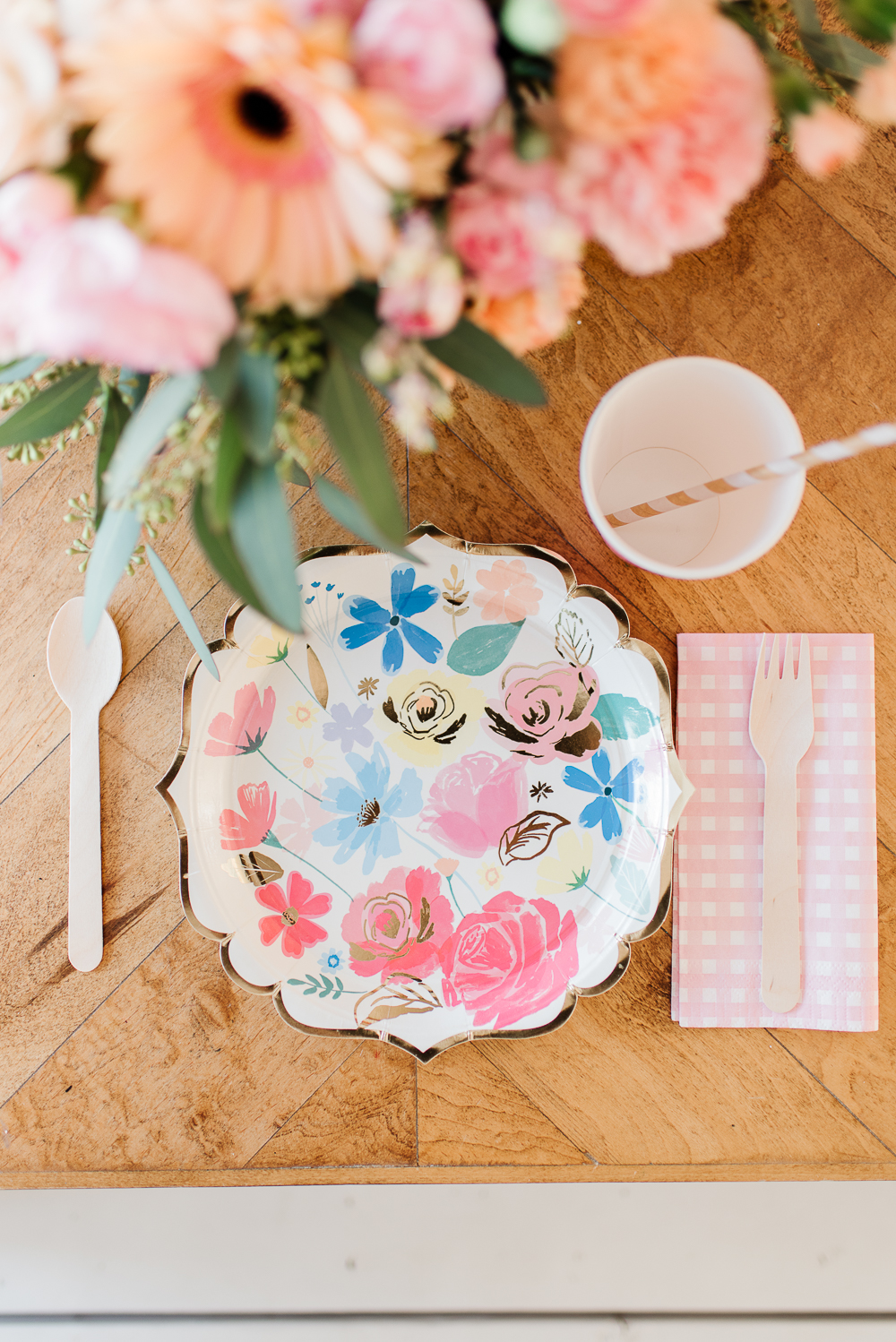 The table was set using floral plates, pink cups, gingham napkins, and wooden cutlery. I cannot find our exact set online, but I love these gingham plates, cups, and napkins and they fit the theme perfectly. The mix of colours and patterns is fun and using disposable makes the end-of-party clean-up so much easier.