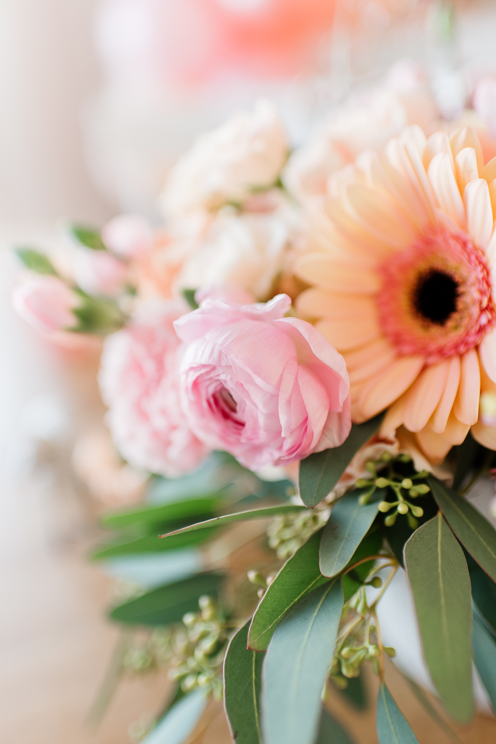 I created a beautiful floral arrangement using a mix of ranunculus, gerbera daisies, spray roses, carnations, and seeded eucalyptus. Living in a small town, finding unique flowers on a budget can be difficult, I always visit our local flower shops to find a few special varieties and then fill in the rest of the arrangement with budget-friendly grocery store flowers. I always make sure I save a few flowers to create a miniature arrangement that can be placed on the sideboard or in the kitchen to help fill in any empty spaces while I’m decorating.