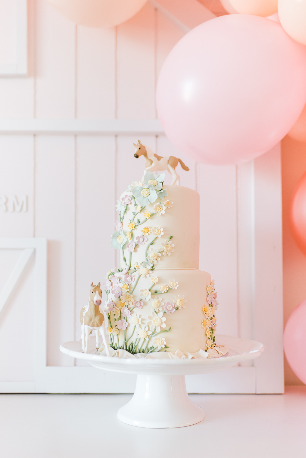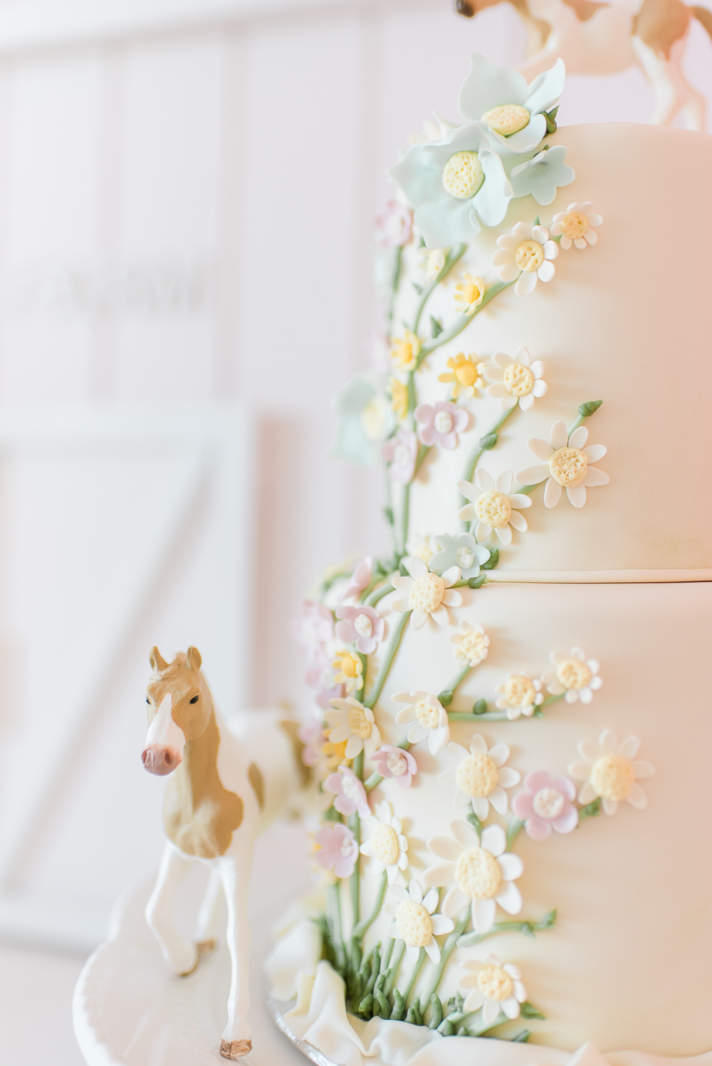 For Zoe’s party, she made a two-tiered cake with the most delicate pastel-coloured flowers climbing the sides and we used two more toy horses to finish it off (mare and foal). The idea was to create a cake that brings to mind a meadow of wildflowers for where horses run and play.