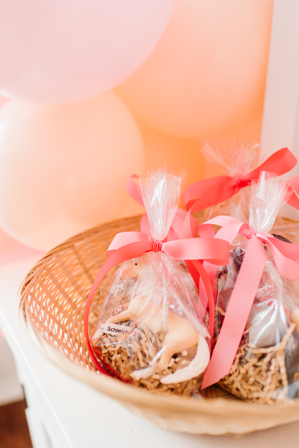 Goodie bags are a fun and thoughtful way to thank guests for attending your party and kids love the idea of getting a little something special too. I always try to keep our goodie bags centered around our theme so this year we sent each friend home with their own toy horse, packaged in a cellophane bag filled with shredded paper to resemble straw and tied with a ribbon.