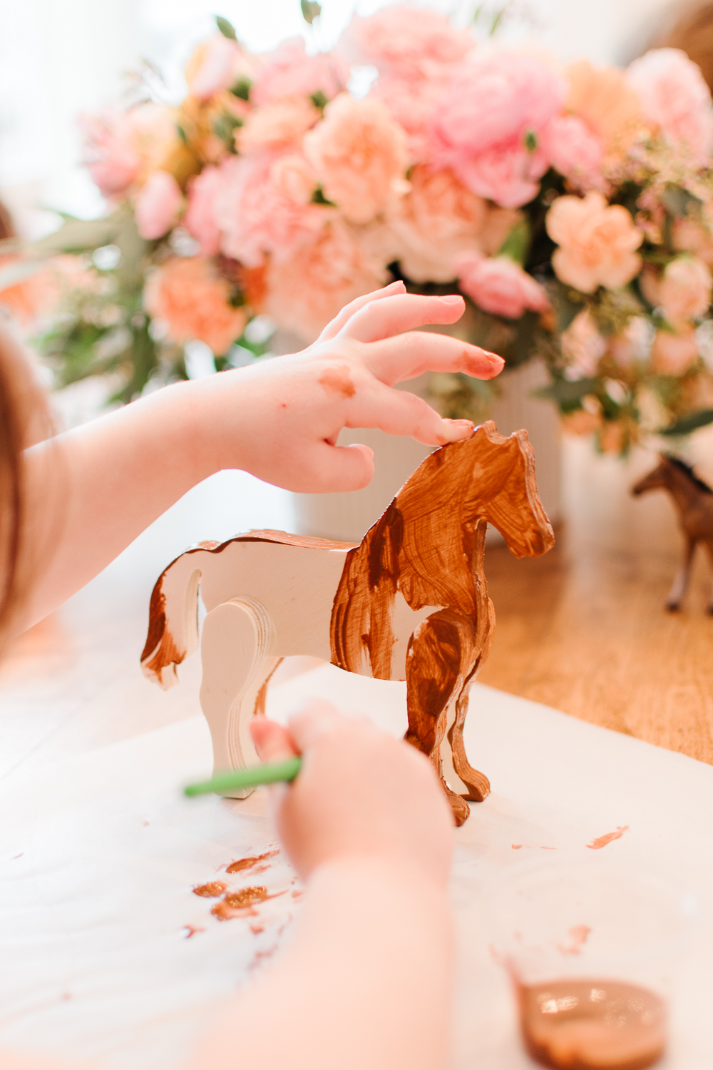 We always make sure we have a few fun crafts planned to keep the girls and their friends busy. Zoe and her guests’ decorated wooden horses (similar) with paint, flowers, and stickers. It was an easy, inexpensive, and fun craft for them to make and take home.