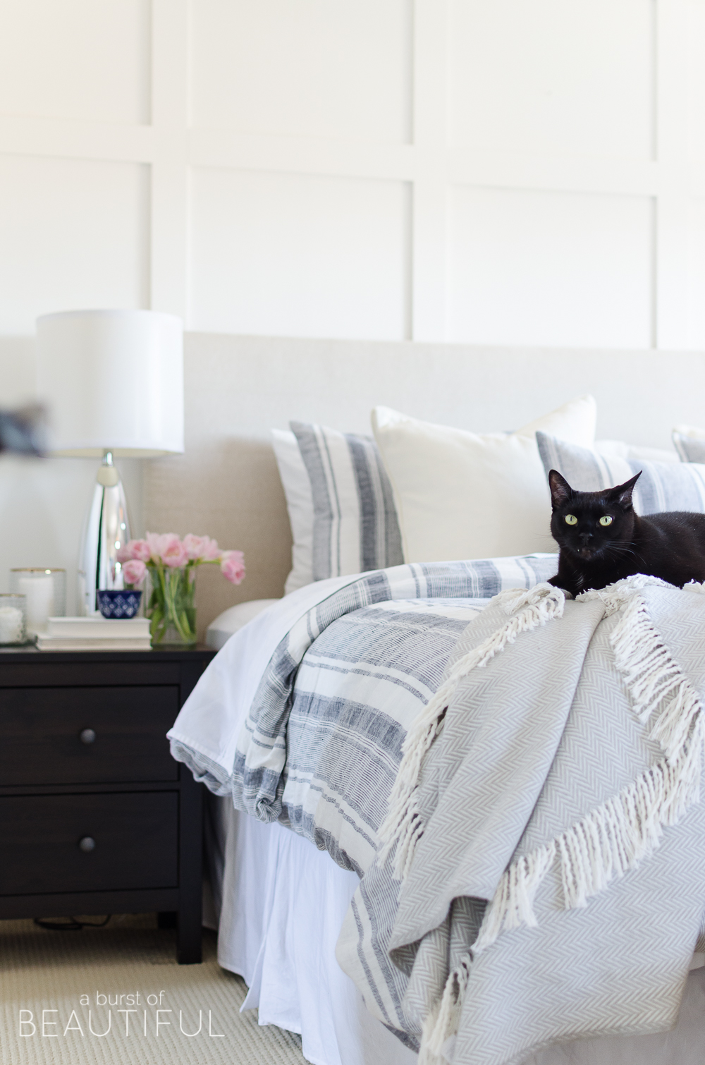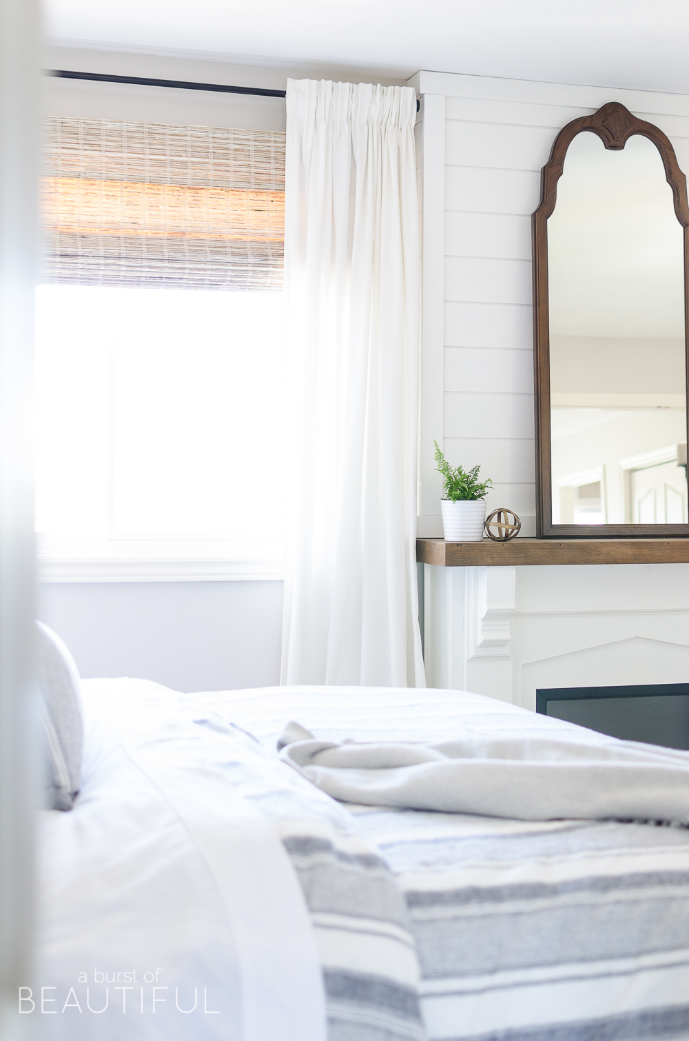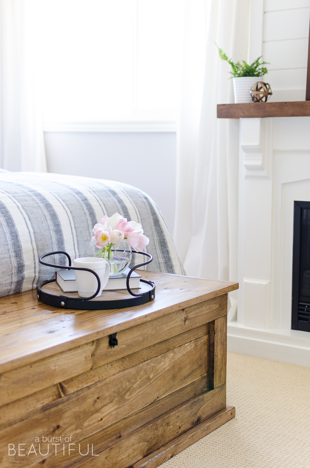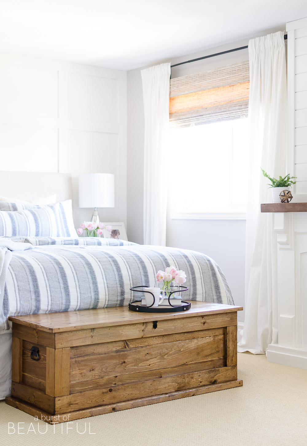 With a board and batten wall treatment, shiplap fireplace and indigo ticking stripe bedding, our master bedroom is the epitome of modern farmhouse charm. It is bright and cozy and the perfect place to relax after a long day.