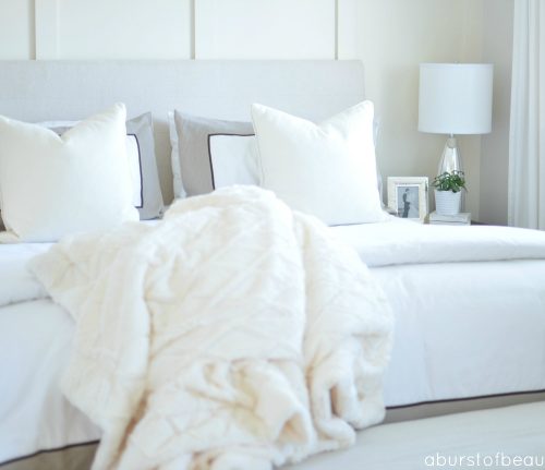 I’m so excited to share one of our favorite DIY projects with you today. Do you remember when we participated in the One Room Challenge? We completely transformed our tired and boring bedroom into a beautiful farmhouse-inspired retreat with vintage flair. The biggest change we made was installing this gorgeous paneled wall behind our bed….